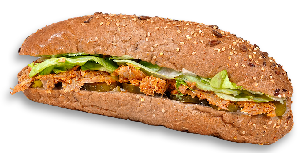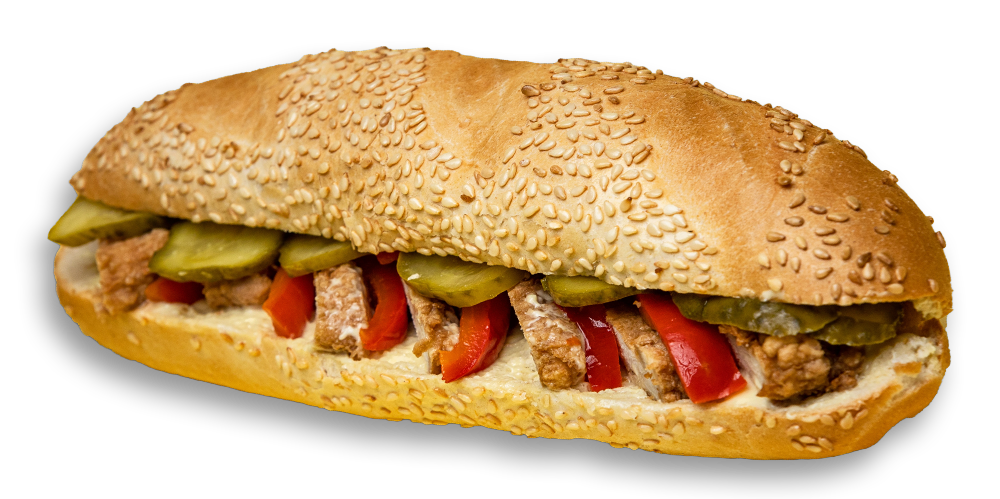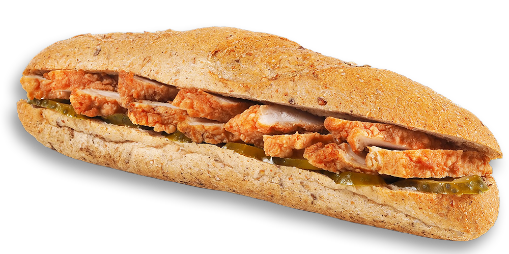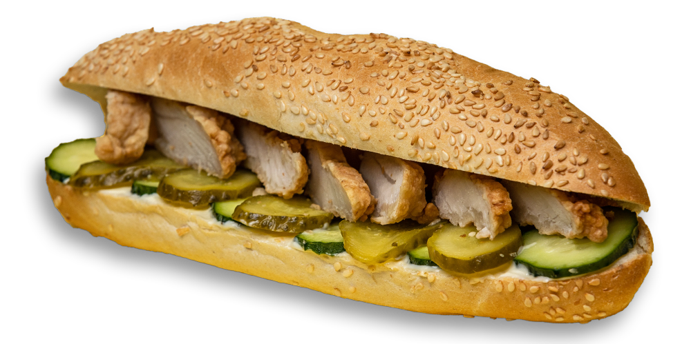 Castraveți acri, maioneză picantă, șnițel de pui, baghetă kornspitz