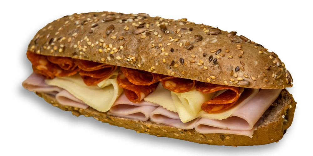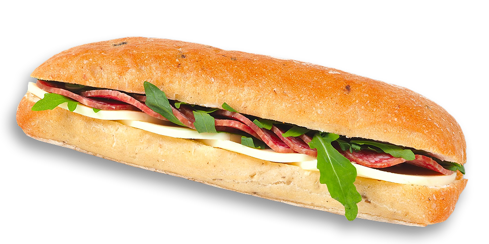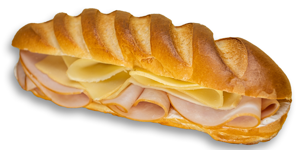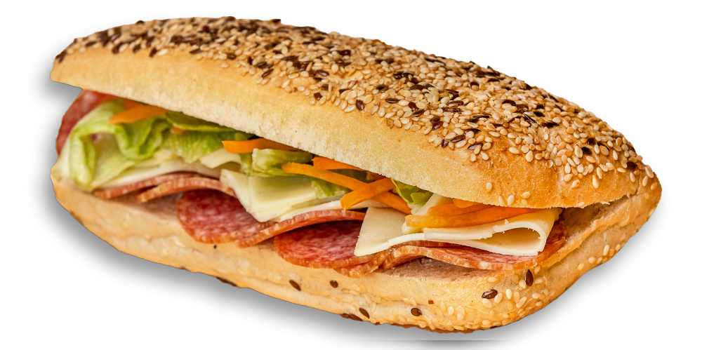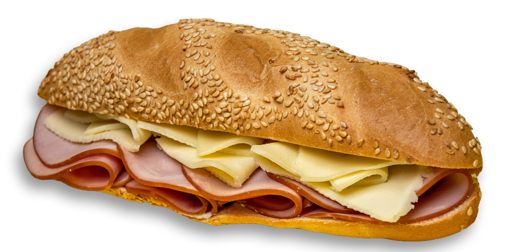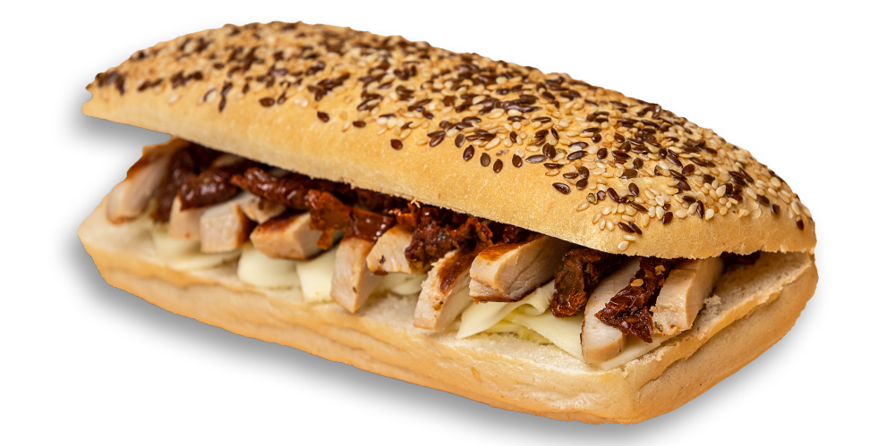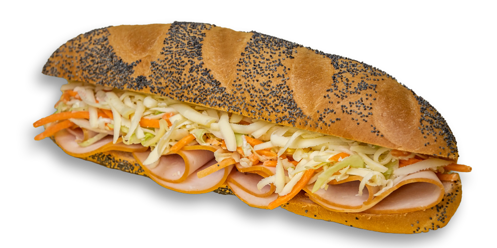 Cașcaval, maioneză, mușchi de porc, salată de crudități, baghetă cu maia și mac