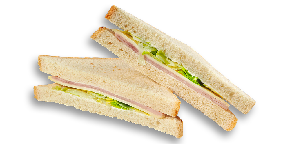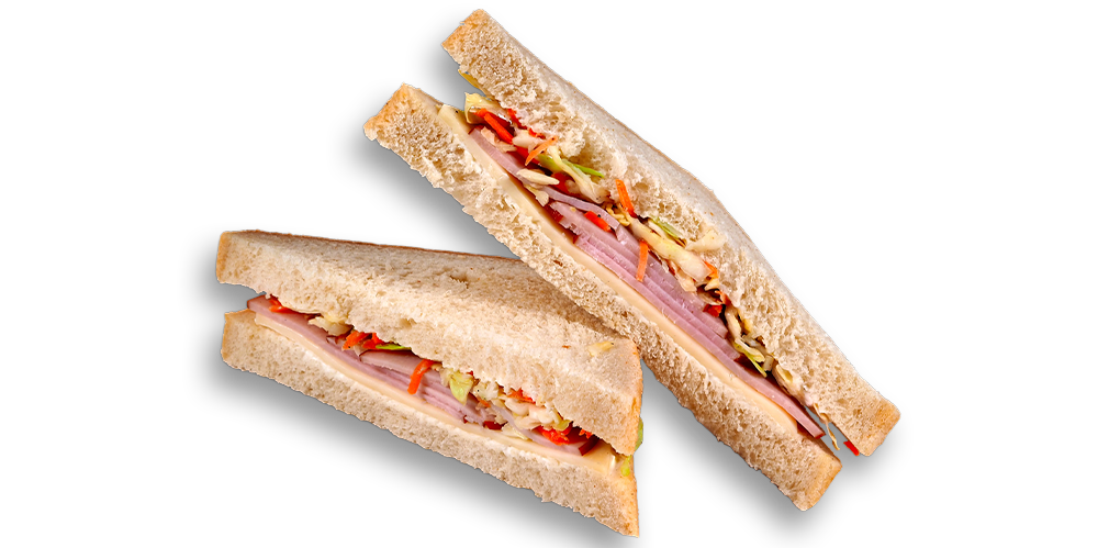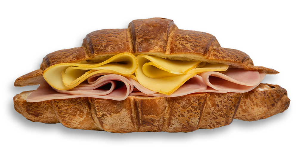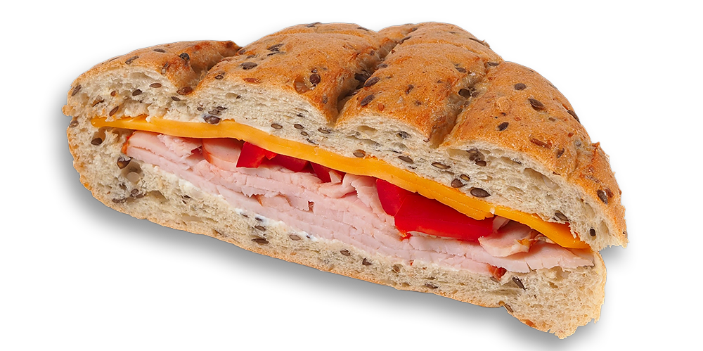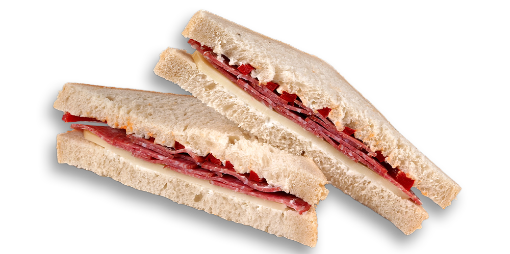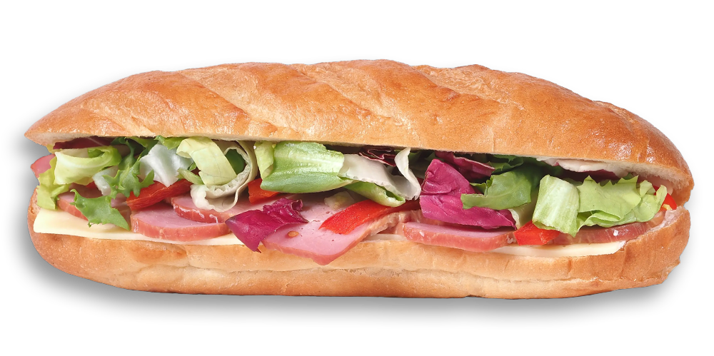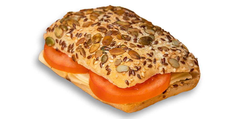 Cașcaval, maioneză, mușchi de porc, salată de crudități, baghetă cu maia și mac