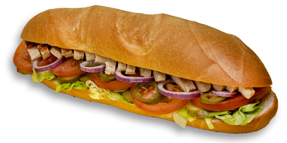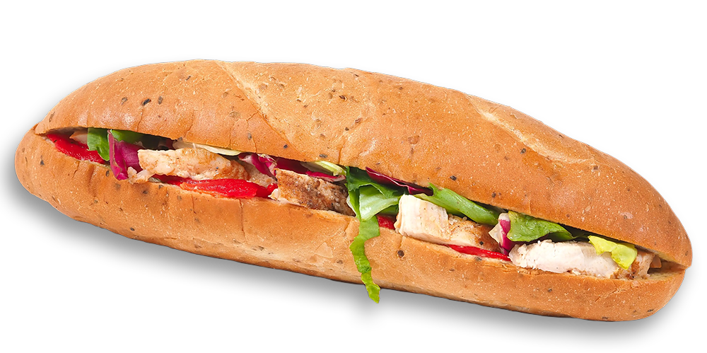 Salată eisberg, ardei iute murat, roșii, castraveți acri, maioneză, piept de pui la grătar, baghetă albă
